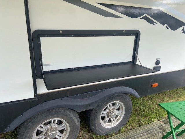 This fold-down table is crafted from durable extruded aluminum and stainless steel, finished with a black textured powder coating for enhanced corrosion resistance. Designed to support up to 20 kg, it offers a sturdy and reliable surface ideal for camping or outdoor use. Its robust construction ensures long-lasting performance while maintaining a lightweight profile for easy and installation with the hardware supplied, it folds away discreetly when not in use, preserving your trailer’s sleek profile. Ideal for those who appreciate both style and practicality in their outdoor adventures. comes with two keyed locks for secure transport