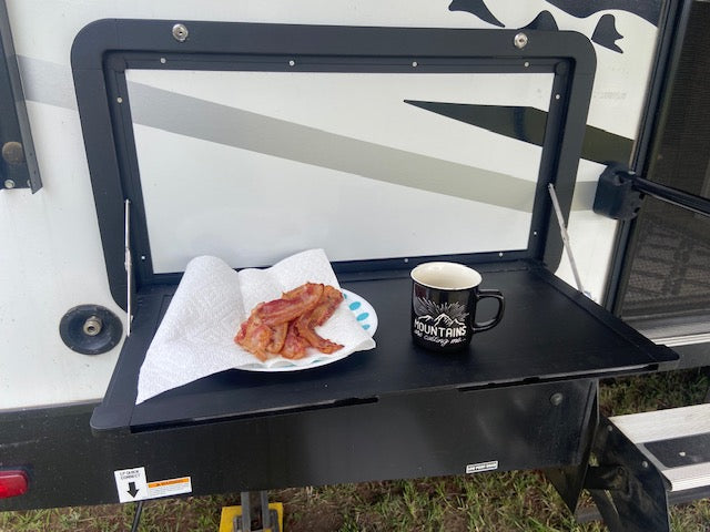 This fold-down table is crafted from durable extruded aluminum and stainless steel, finished with a black textured powder coating for enhanced corrosion resistance. Designed to support up to 20 kg, it offers a sturdy and reliable surface ideal for camping or outdoor use. Its robust construction ensures long-lasting performance while maintaining a lightweight profile for easy and installation with the hardware supplied, it folds away discreetly when not in use, preserving your trailer’s sleek profile. Ideal for those who appreciate both style and practicality in their outdoor adventures. comes with two keyed locks for secure transport